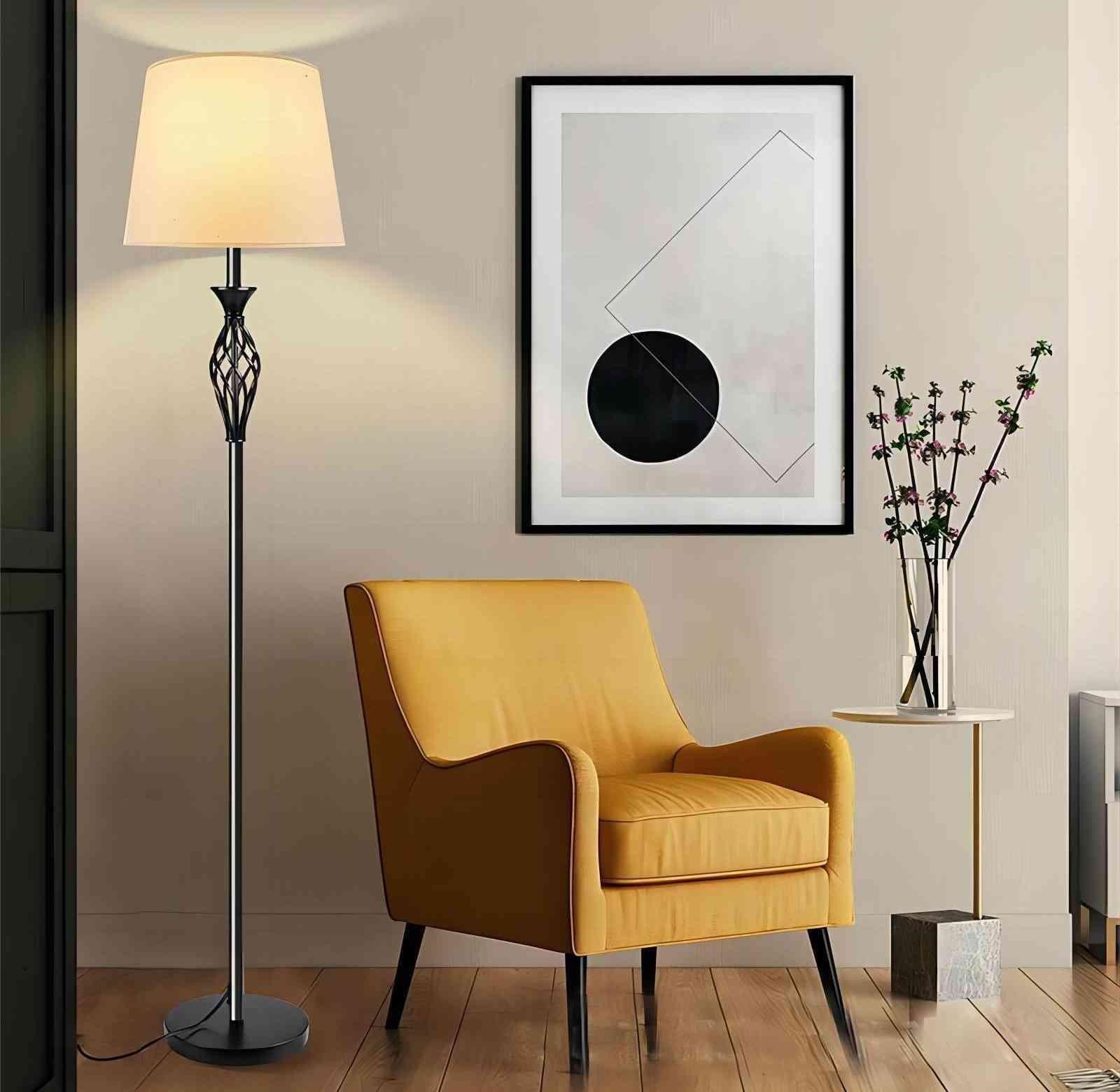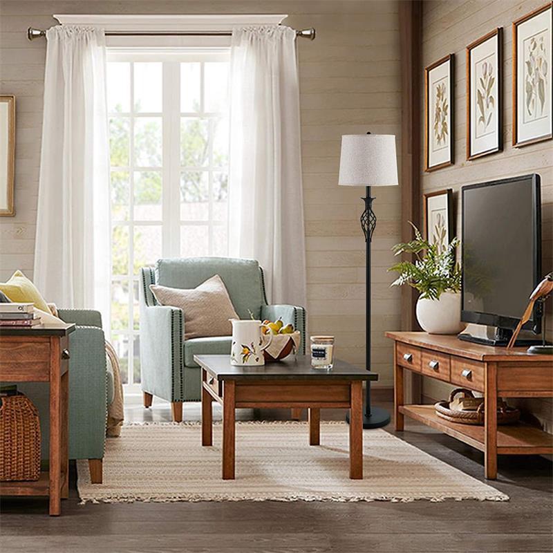 The Aria floor lamp elevates its ornamental elegance with a tall structure that incorporates the same signature openwork design, delivering visual character and refinement. Its matte black finish contrasts with the white cone-shaped shade, casting a warm light ideal for living rooms, bedrooms, or entryways. This lamp merges art and function in one piece. Compatible with E26 bulbs, includes UL-certified plug cable and accessible switch for safe and practical use.