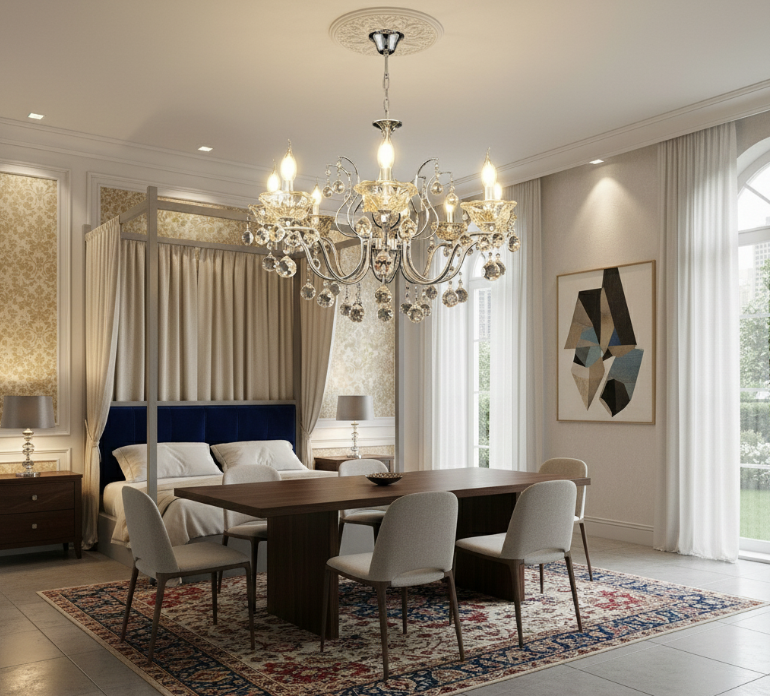 Designed to impress from every angle, the AURELIS CS4-8 is a large-scale chandelier that merges traditional luxury with modern technology. Its solid iron frame is adorned with dazzling K9 crystals that capture light intensely, creating a sparkling, theatrical effect. With a 750 mm diameter and a height of 1000 mm, this model features eight E14 bulbs—ideal for illuminating large spaces with both warmth and brilliance. Thanks to its cool-warm temperature control, the lighting can be adjusted to suit the desired mood, making this piece as functional as it is decorative. Available in chrome, French gold, black, and white finishes, it stylishly complements classic, neoclassical, or upscale contemporary interiors. Its decorative arms and cascading crystal drops add refined aesthetics, making it ideal for lobbies, event halls, large dining rooms, or elegant residences. Delivered with the light source included and secure packaging (500×350×180 mm), this chandelier doesn’t just light.