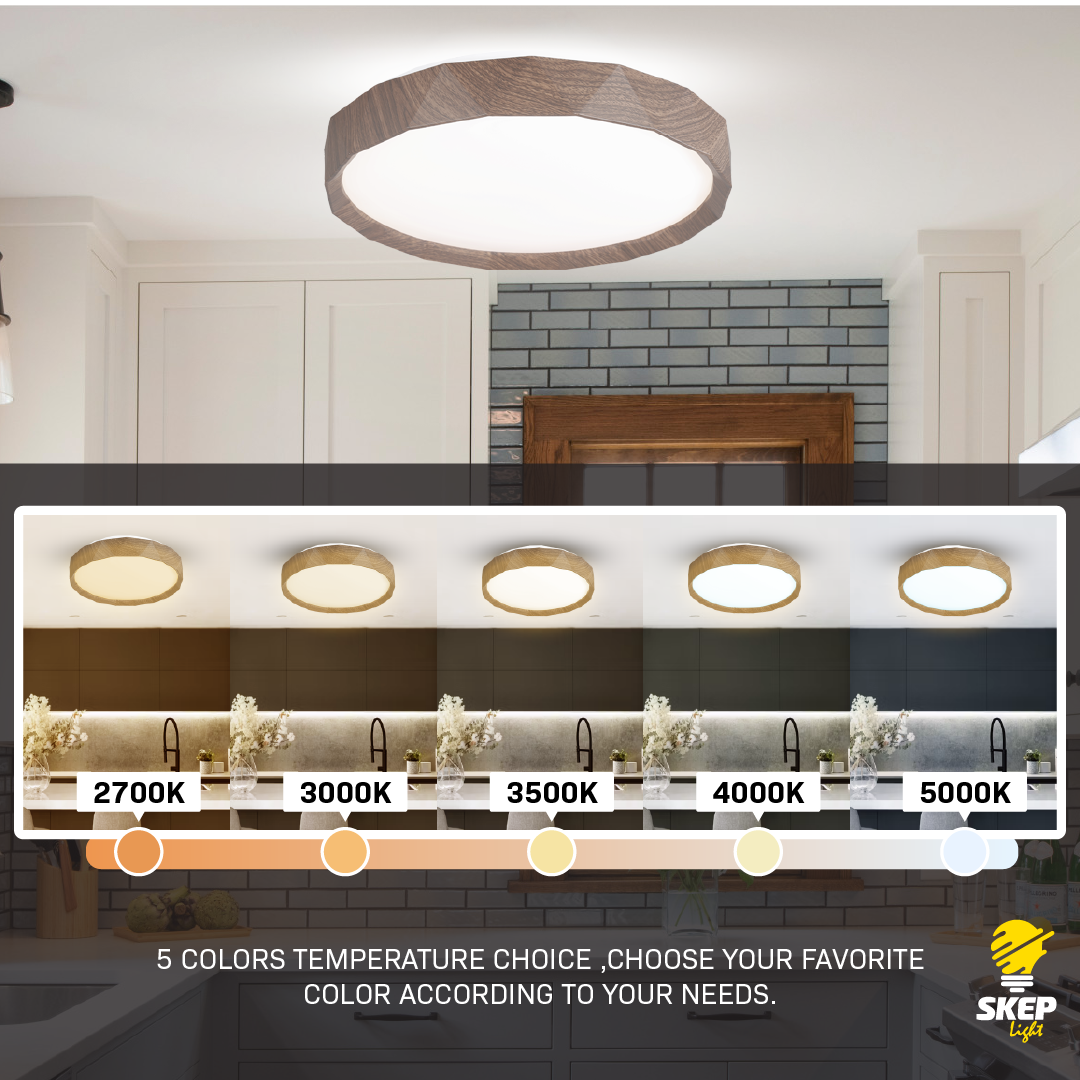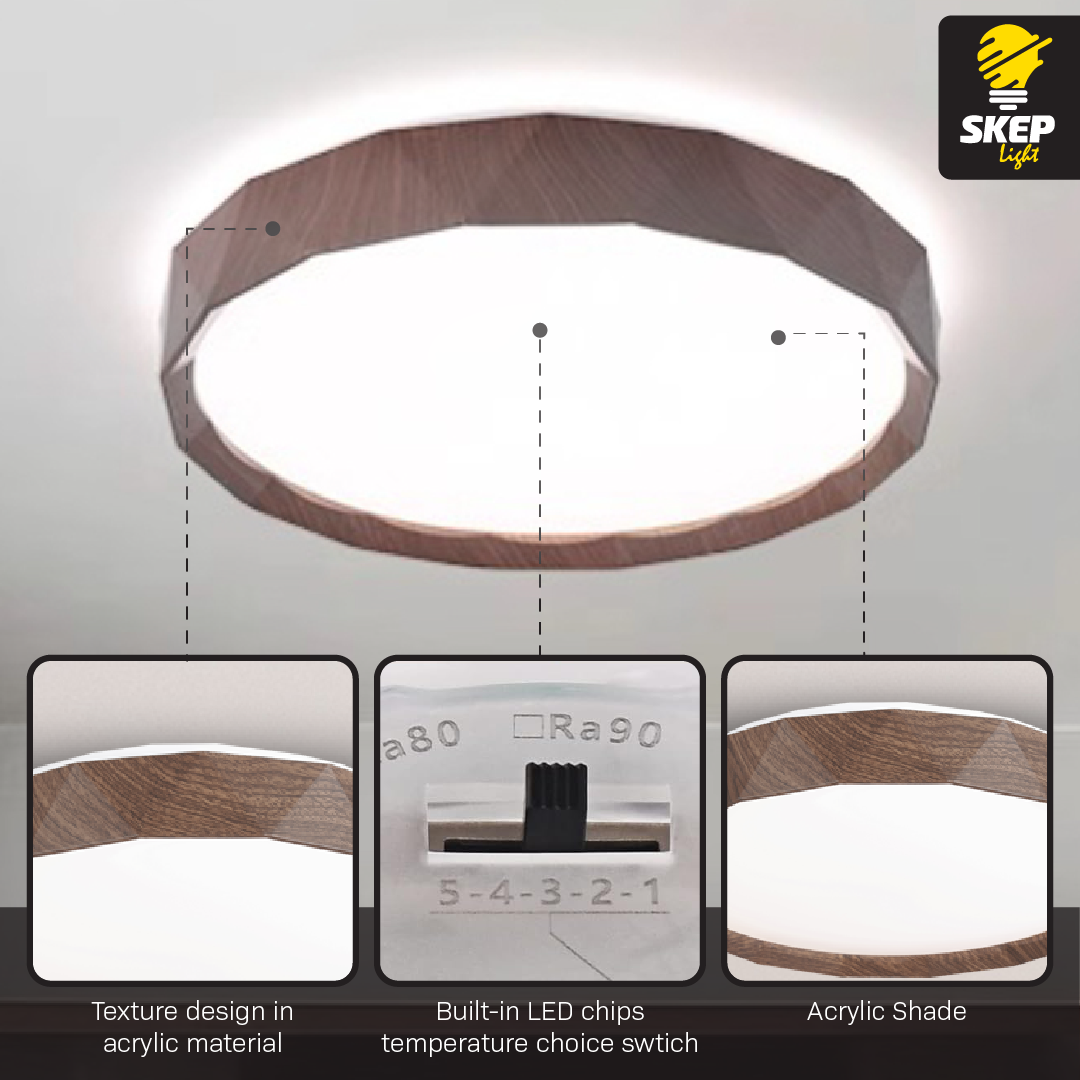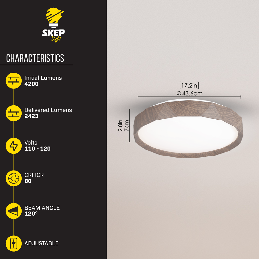 PANEL LED FLUSH MOUNT CEILING LIGHT FIXTURE 42 W – WALNUT WOOD. Combining functionality with timeless design, this 42W LED ceiling panel features a rich walnut wood finish, making it the ideal addition to rustic, vintage, or elegant interiors. Its adjustable light temperature (2700K, 3000K, 3500K, 4000K, 5000K) allows you to create customized atmospheres with ease. A perfect blend of performance and aesthetics, this fixture is well suited for living rooms, dining areas, offices, and beyond.