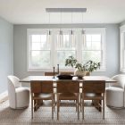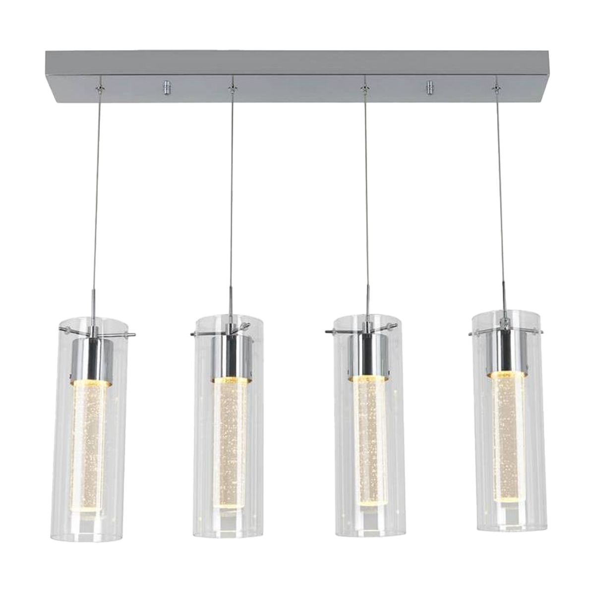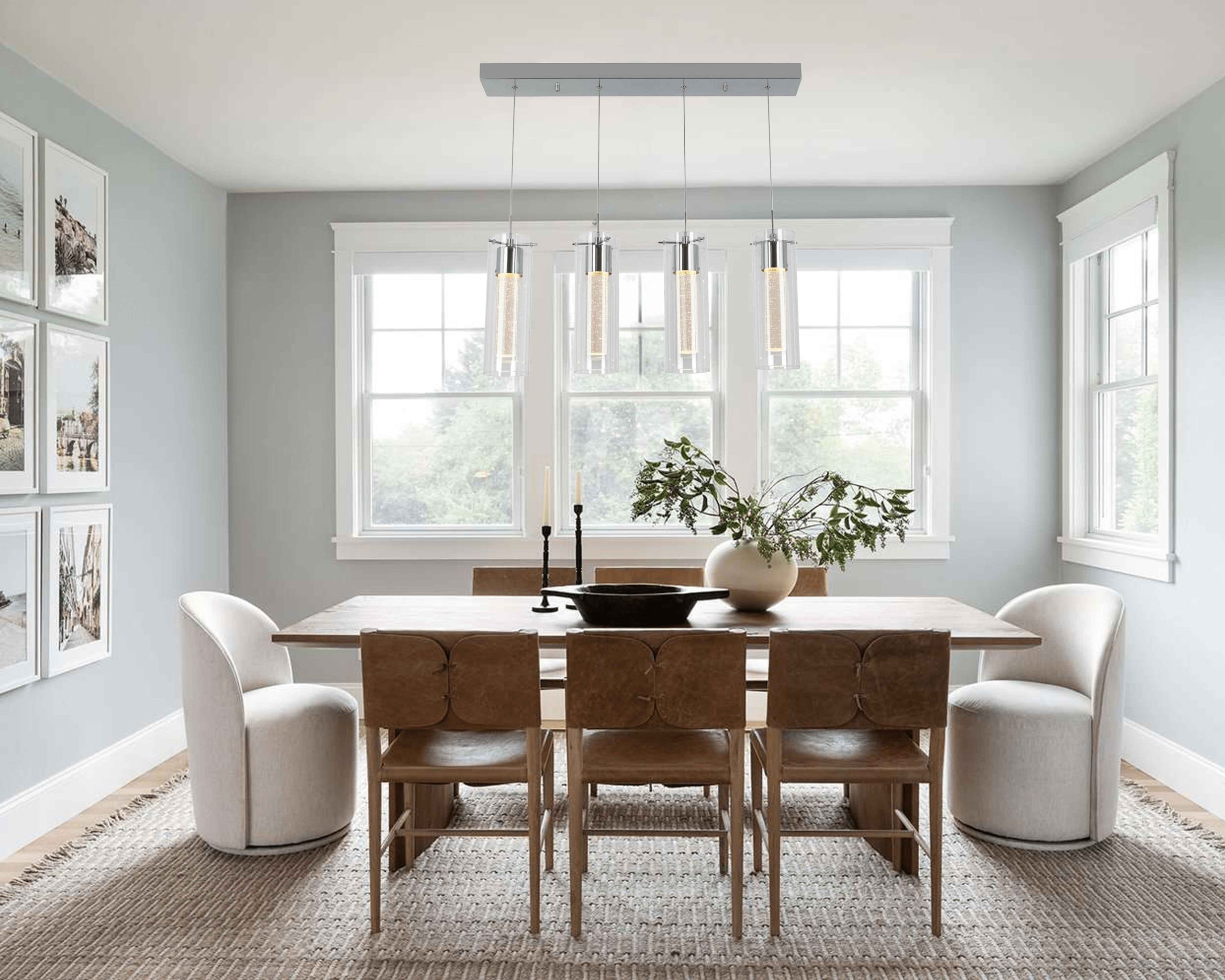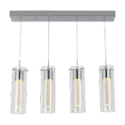 Diana LED Pendant X4 – Pendant Light. Ideal for those seeking symmetry and sophistication, this chrome steel pendant lamp features four lights suspended in a linear arrangement, perfect for dining rooms, work tables, or kitchen islands. Its glossy finish and modern structure add elegance and functionality to any space. Operates at 110–120V/DC26W, 1600 total lumens, dimmable (3CCT), with seedy glass diffusers. Dimensions: 30” x 4-1/2” x 86” height.