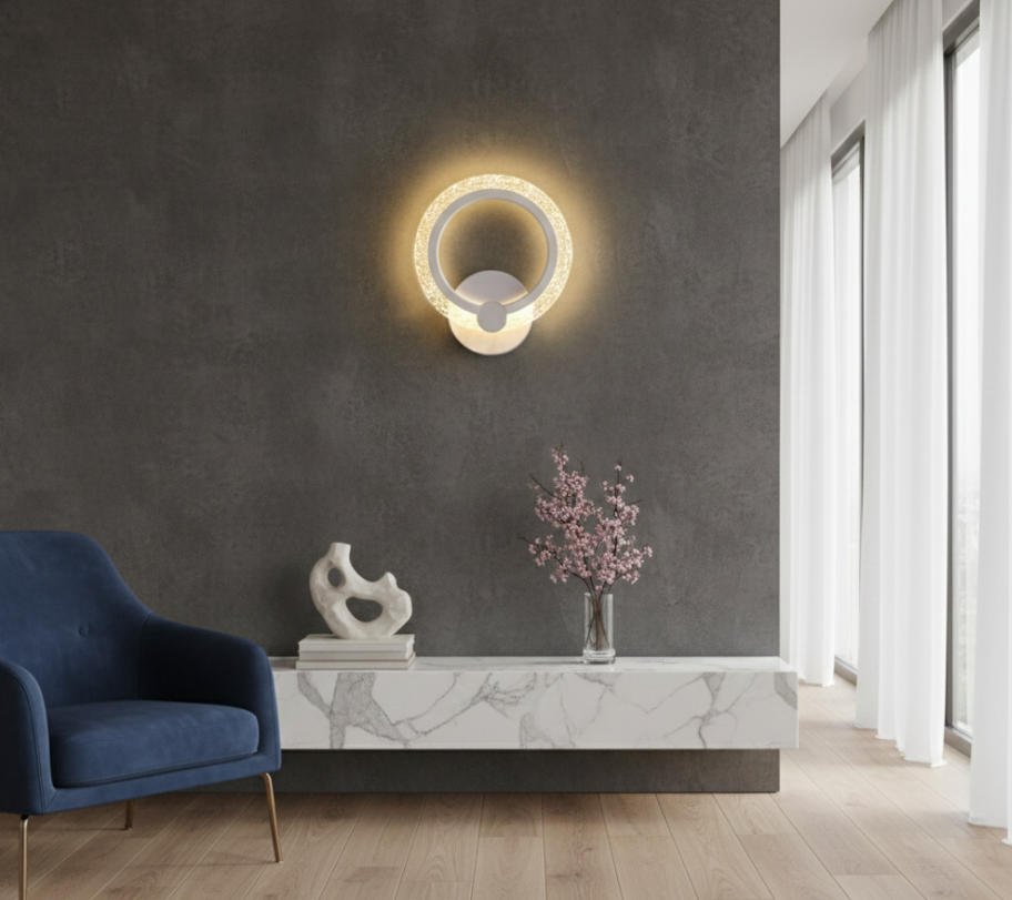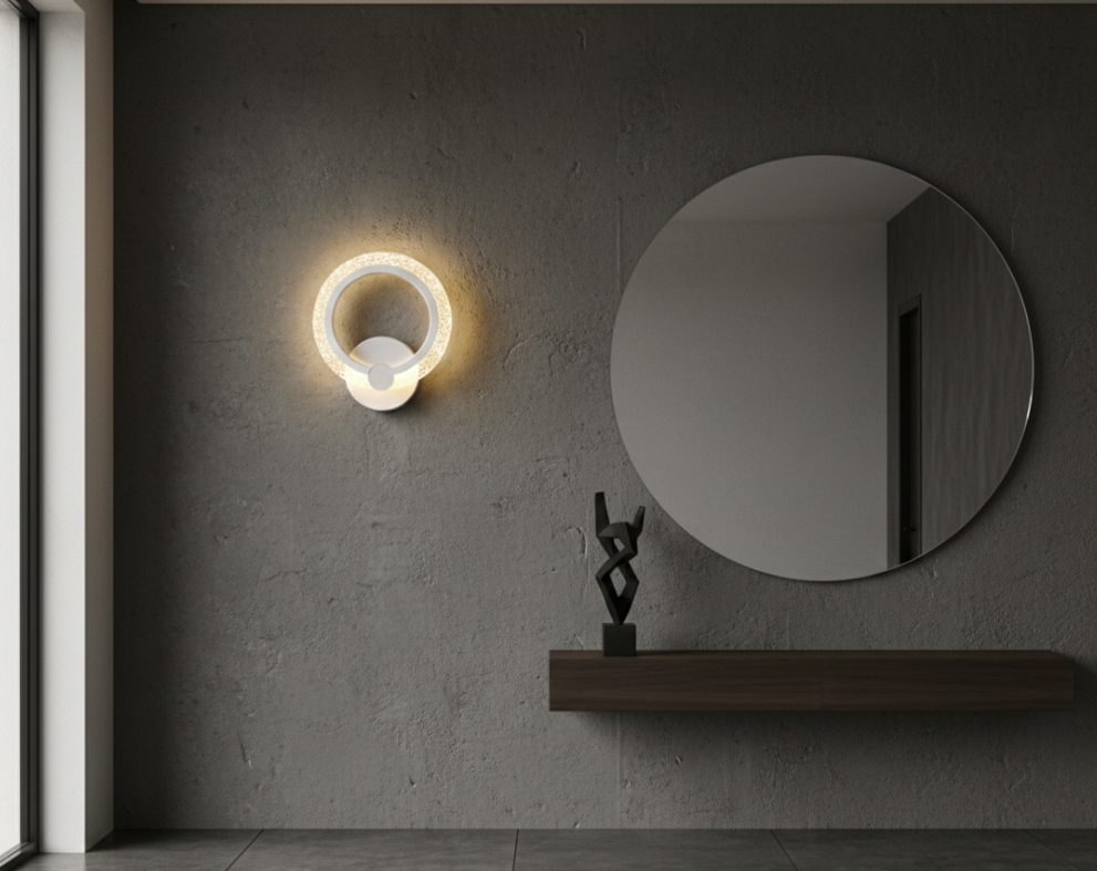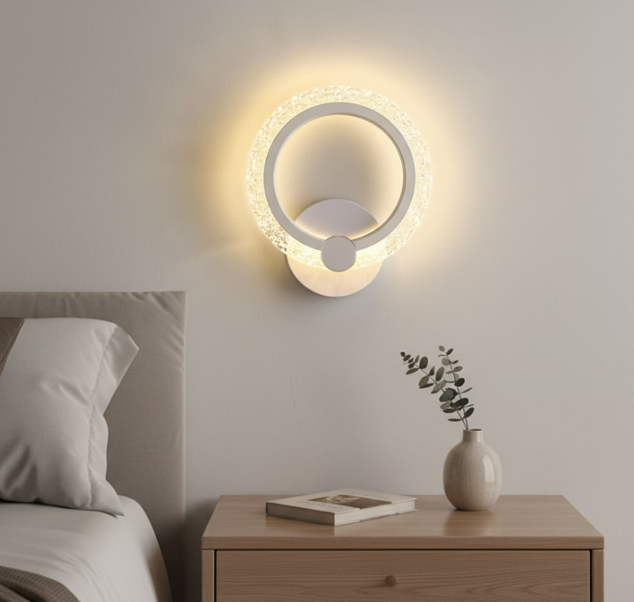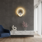The Halo lamp surrounds the wall with a warm LED light ring reminiscent of a delicate eclipse. Its round shape, opaline diffuser, and white aluminum body provide the perfect ambient lighting for headboards or resting areas. Easy to install and ethereal in design, it’s a charming and modern option for any interior.