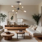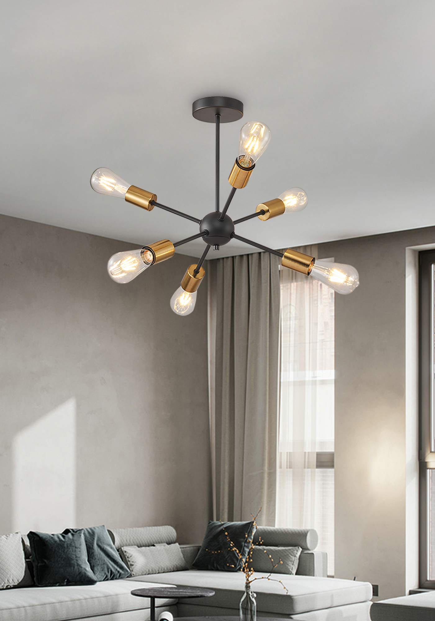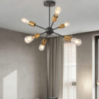 GUISELLE Vintage Pendant Lamp – Gold and Black (460×420 mm). Inspired by atomic and star-like shapes, this pendant lamp from the Guiselle series features a bold matte black frame with golden accents for a striking, sophisticated finish. Equipped with six E26 vintage-style bulbs, it adds a retro-industrial touch to any space—be it a modern dining room, living area, or commercial setting. A sculptural piece that transforms the ceiling into a focal point.