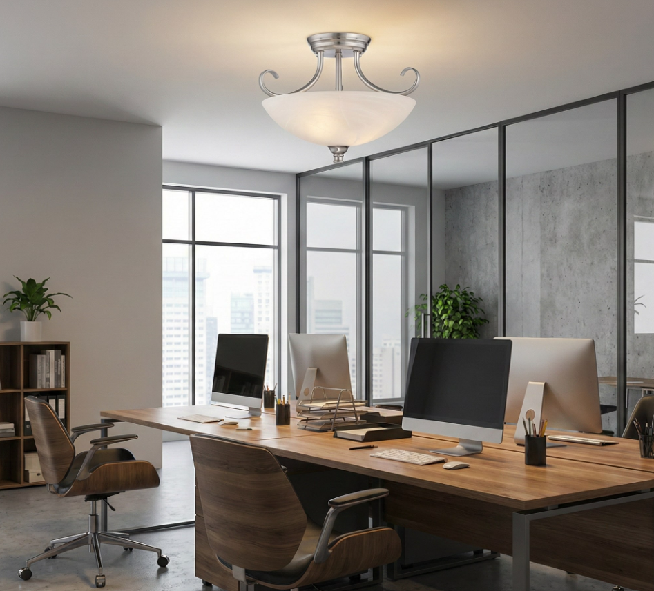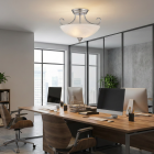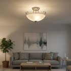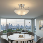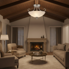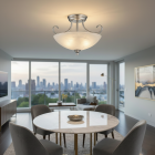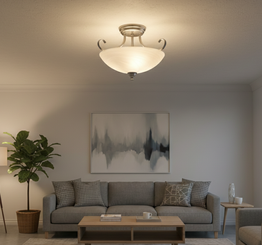Julia Series, Ceiling Lighting Pendant x 2 Bulbs. The Julia pendant lamp is a decorative piece with subtle elegance, finished in brushed nickel (BN) and featuring an alabaster glass shade that projects warm, inviting light. Its soft curves and compact size (13″ in diameter x 10-1/2″ high) make it versatile for multiple settings, from hallways to bedrooms. It uses two E26 bulbs of up to 100W (not included), combining classic beauty with practical functionality.
