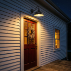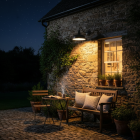 Kyle Outdoor Lantern (Curved Model) – LED Outdoor Lantern. Curved version of the Kyle model, with a hanging structure that gives it a classic lantern air. Made of weather-resistant black steel, it’s perfect for main entrances or rustic patios. Its enveloping design emits a warm and welcoming light. Integrated LED technology. Power: 110–120V/AC12W, 750 lumens, adjustable color temperature (3CCT). Dimensions: 12” x 11” x 15-3/8”.