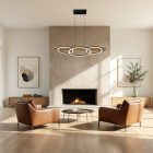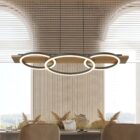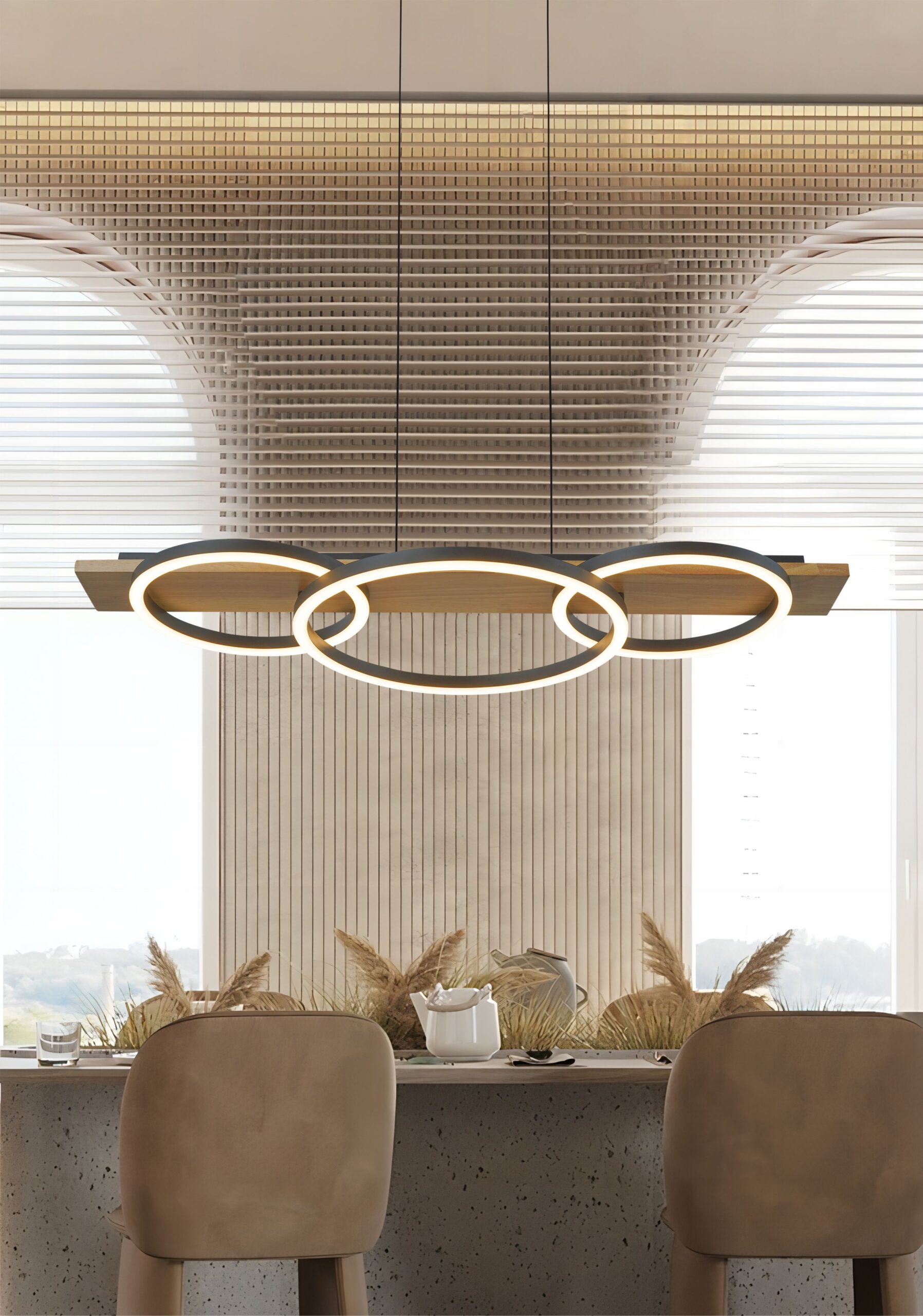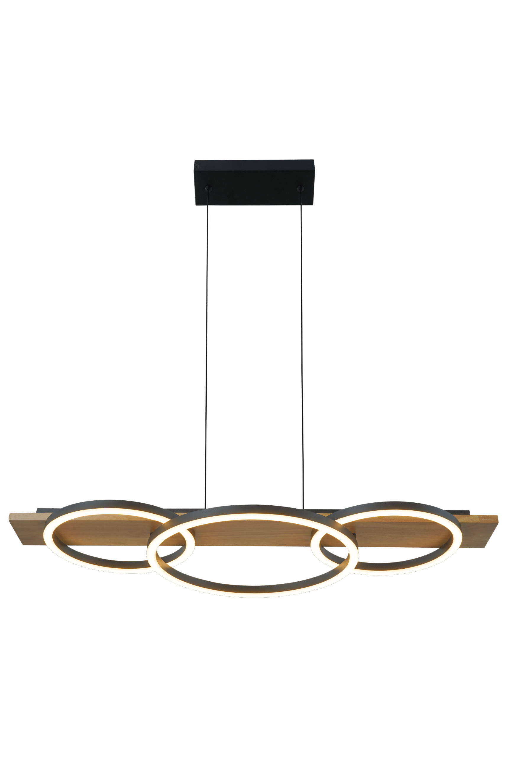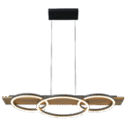 LUCIA Series, LED Pendant Lamp – 800×350×95 mm, 40W, Wood and Black.Merging organic warmth with modern form, the Lucia pendant lamp features a black metal structure with natural wood accents. Its overlapping circular rings emit a 40W integrated LED light, dimmable and CCT-adjustable in 5 steps (2700K–5000K). Ideal for dining rooms, living spaces, or interiors with Nordic or natural inspiration.