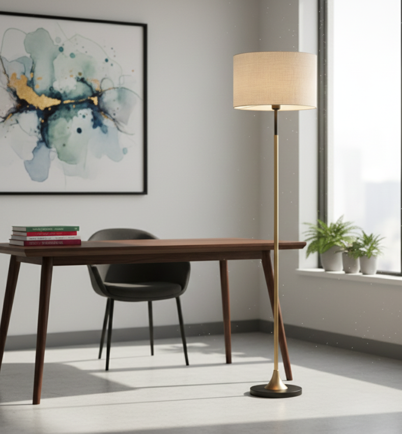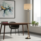 The Lyon floor lamp complements the table version with a taller structure, ideal for lighting corners, living rooms, or studies. Its classic-modern design with wood and metal base and cylindrical white shade fits well in rustic, modern, or Scandinavian-style interiors. Compatible with E26 bulb, includes UL-certified plug cable and on/off switch.