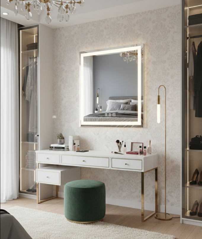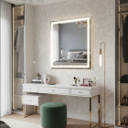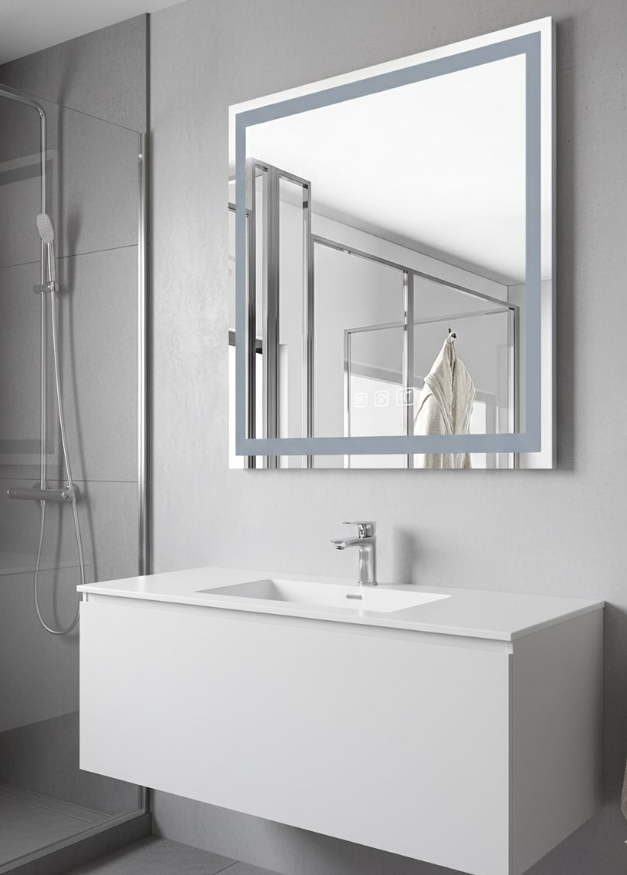 Modern Reflections LED Mirror 30”x30” – LED Mirror. This sophisticated 30”x30” Modern Reflections LED mirror transforms any bathroom or dressing area into an elegant and functional space. With 25W power and a strong 2000-lumen output, it features dimmable technology and adjustable color temperature (3CCT), allowing warm, neutral, or cool light for any time of day. Its white aluminum frame with a refined finish and high-quality glass offer a clean, modern design—perfect for beauty routines or ambient lighting, thanks to its large surface and even illumination