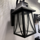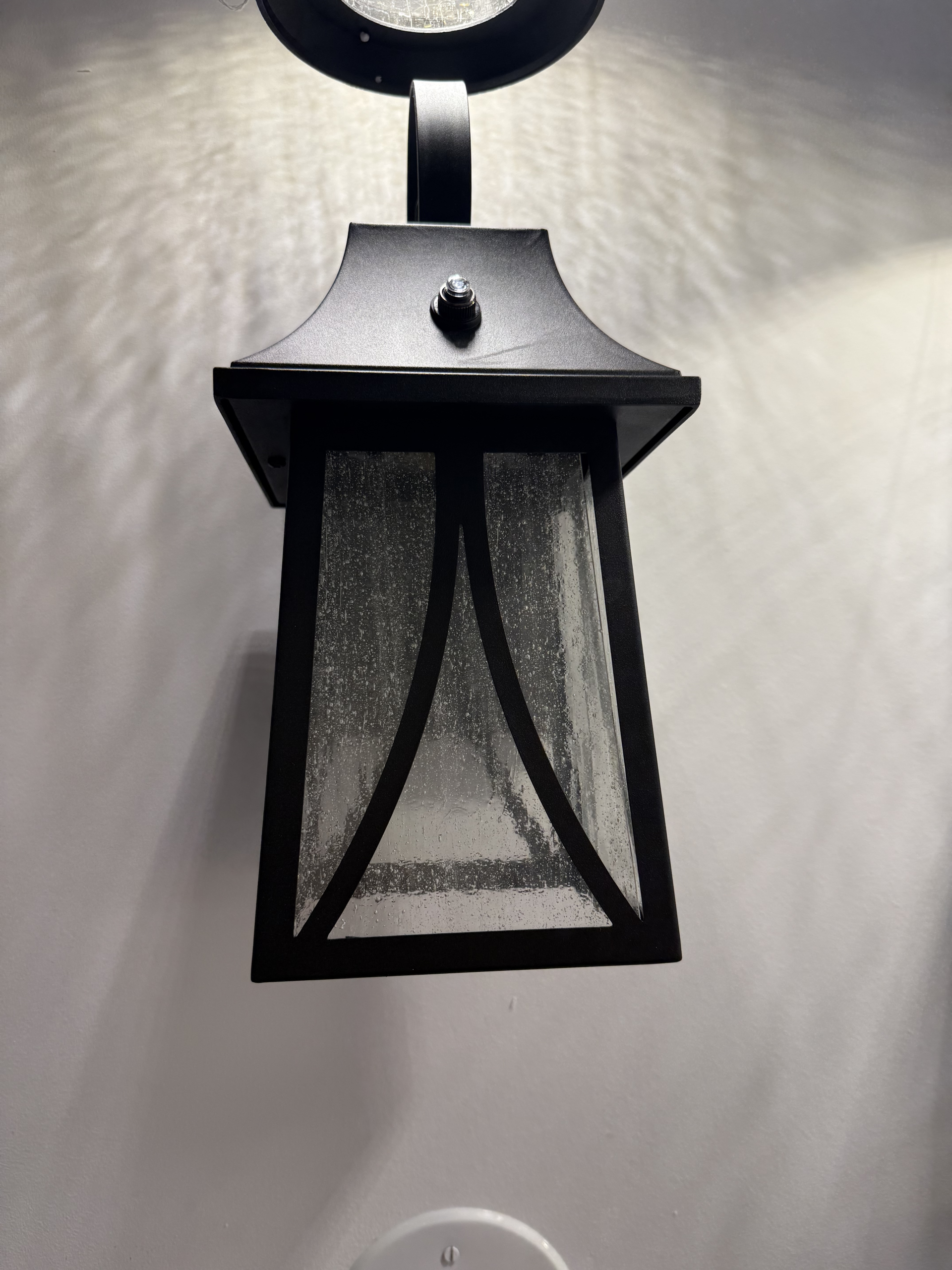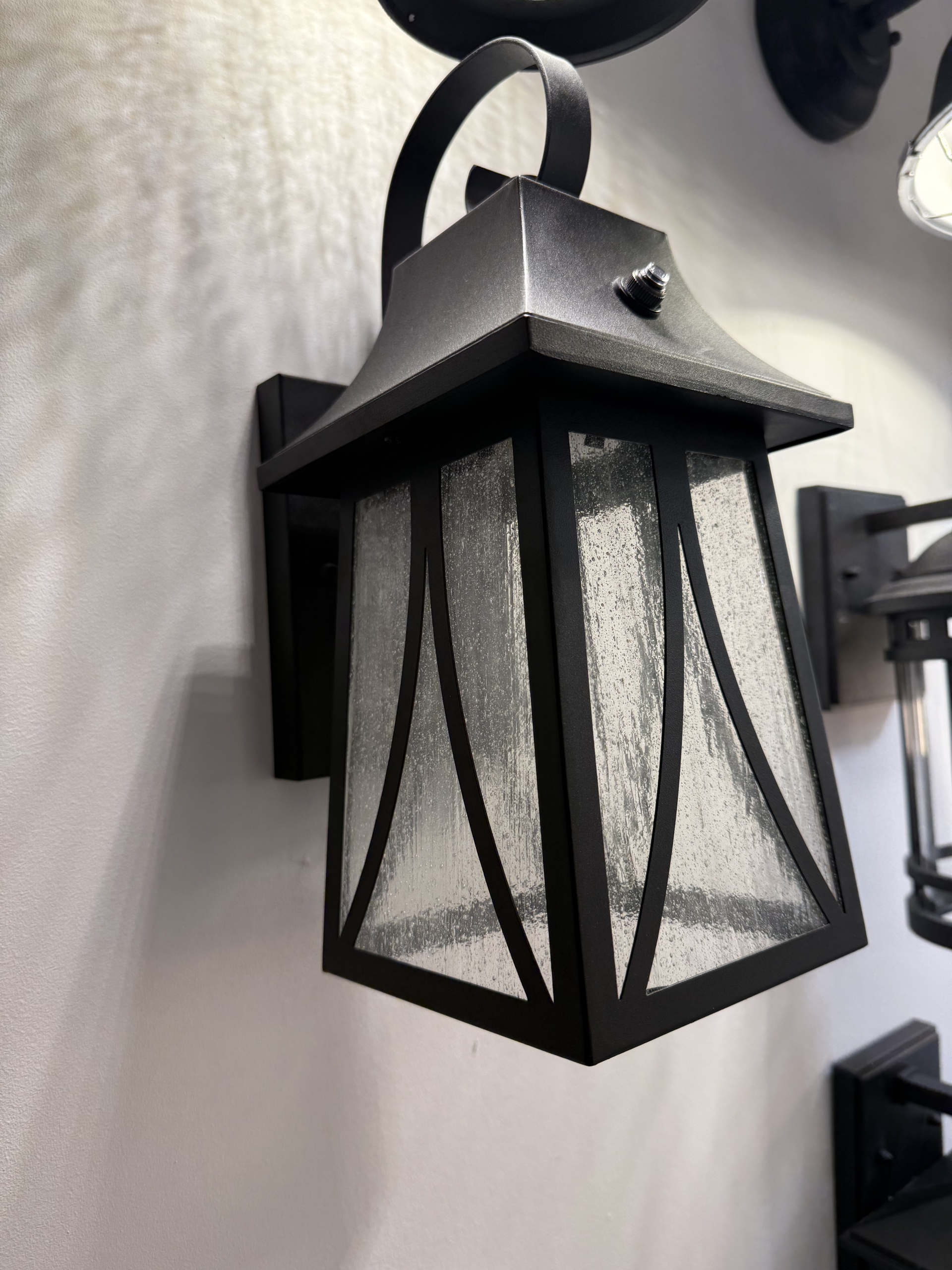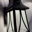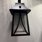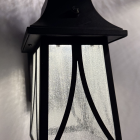 Owen Outdoor Lantern. The Owen lantern stands out with its classic design and decorative top hook that adds elegance and charm. Crafted from black aluminum with seedy glass, its dimensions (12″ high x 7″ wide x 6-1/2″ deep) make it perfect for entryways or exterior corridors. It operates with photocell for automatic on/off, providing stylish, warm, and effective lighting.