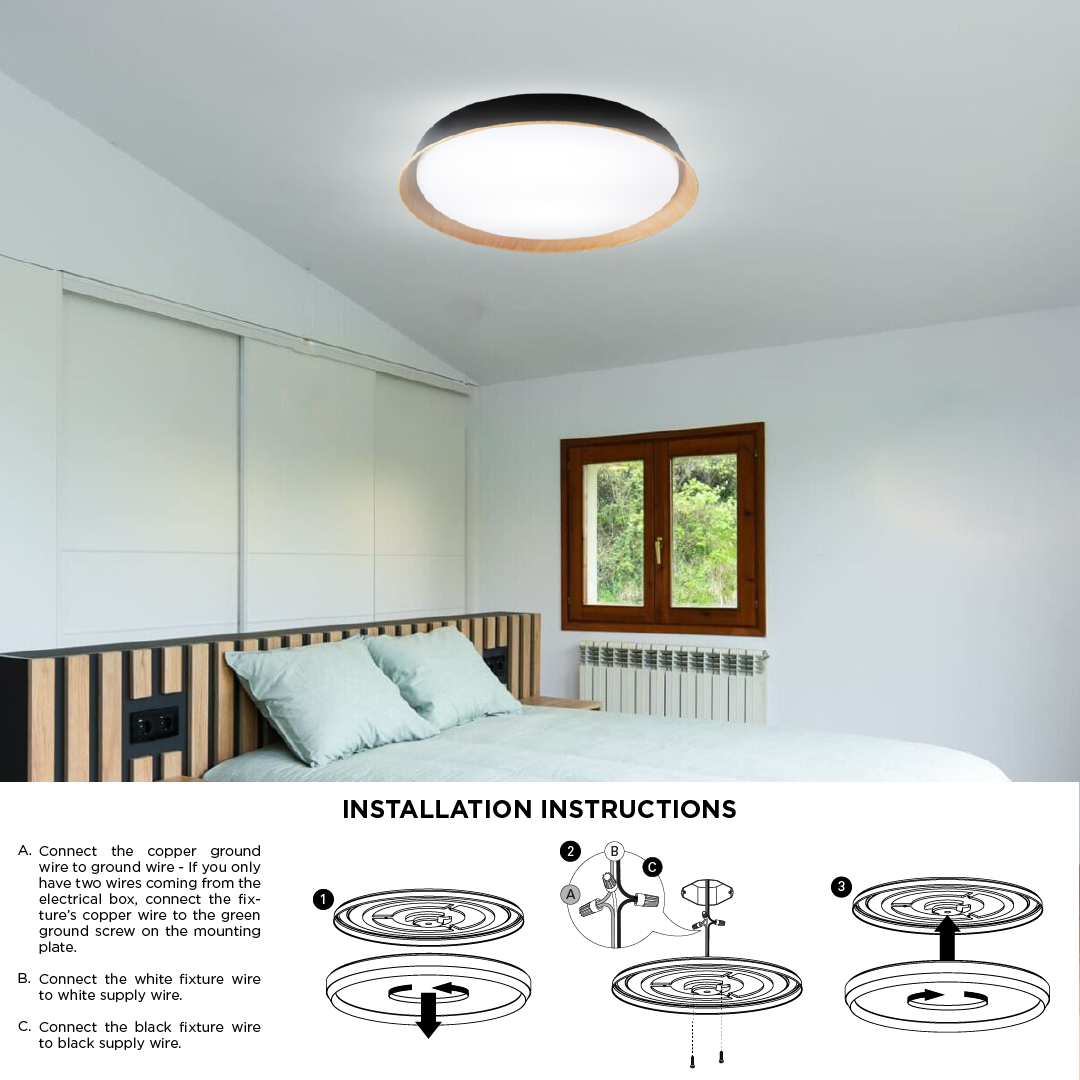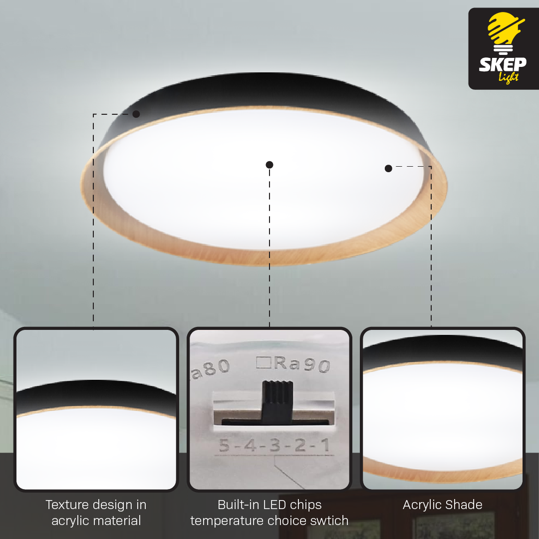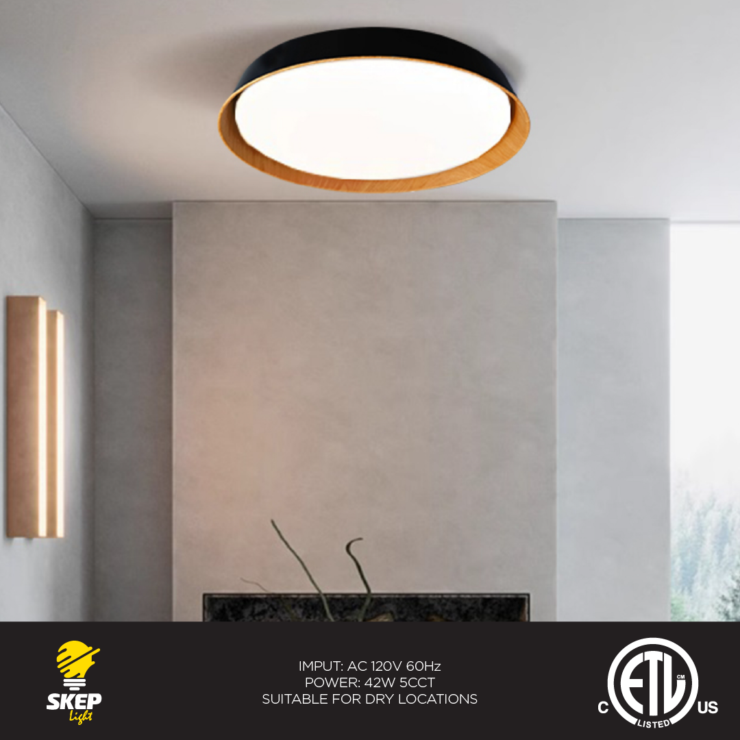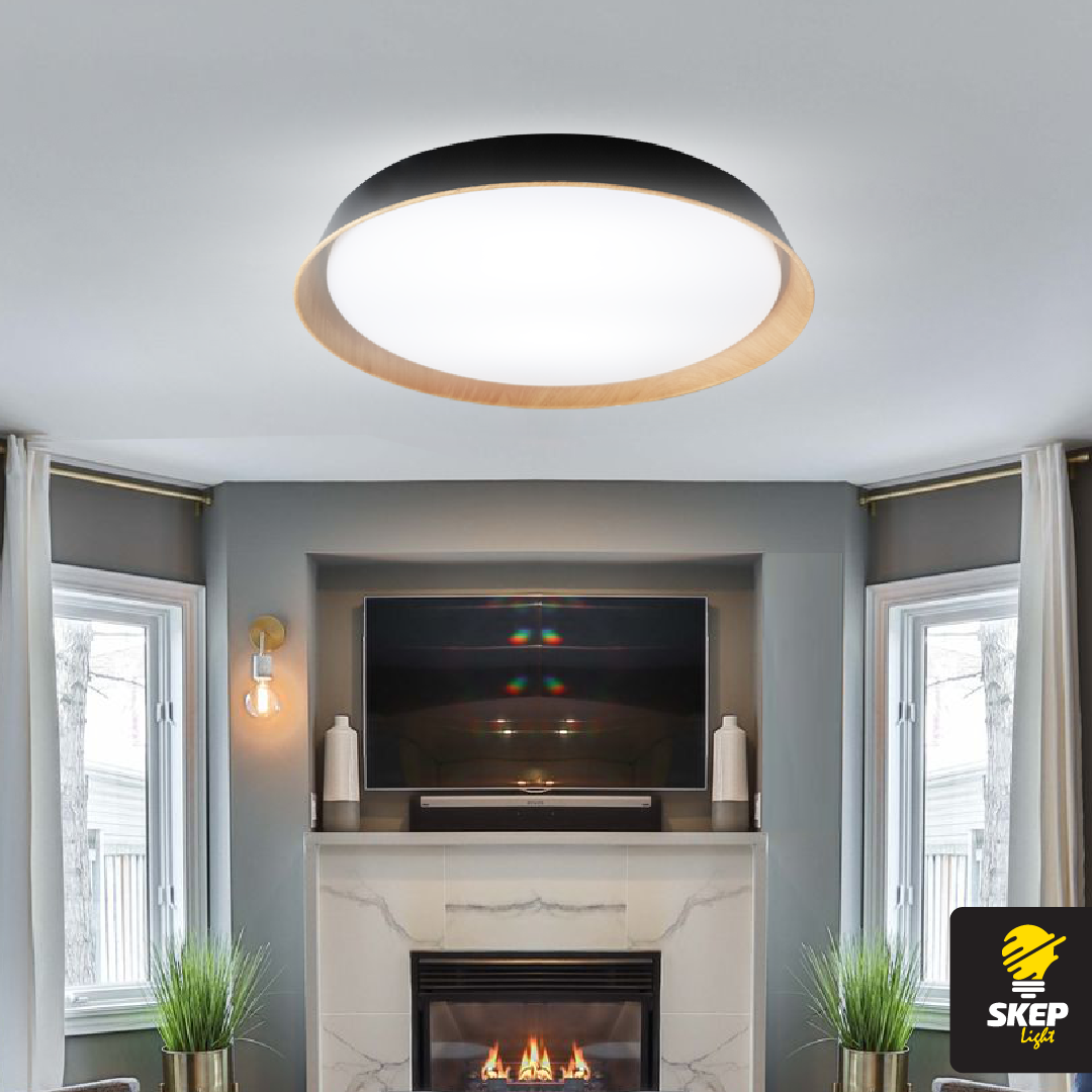 PANEL LED FLUSH MOUNT CEILING LIGHT FIXTURE 42 W – BLACK + WOOD.This striking 42W LED ceiling panel merges matte black with the warmth of natural wood, offering a bold yet versatile lighting solution. With adjustable color temperature from 2700K to 5000K, it adapts beautifully to any time of day or mood. The elegant design and durable materials make it a standout choice for modern, Nordic, or ind