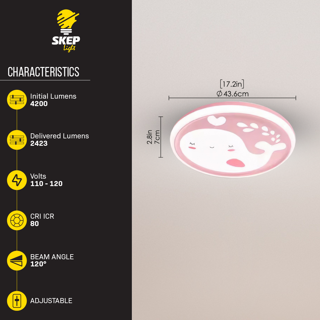 This 42W LED panel in soft pink, adorned with a smiling whale, is perfect for girls’ rooms or playful spaces. With adjustable color temperature (2700K–5000K), it offers everything from gentle night lighting to bright illumination for reading and playing. Crafted from high-quality, child-safe materials, this fixture combines charm, warmth, and functionality in one delightful ceiling light.