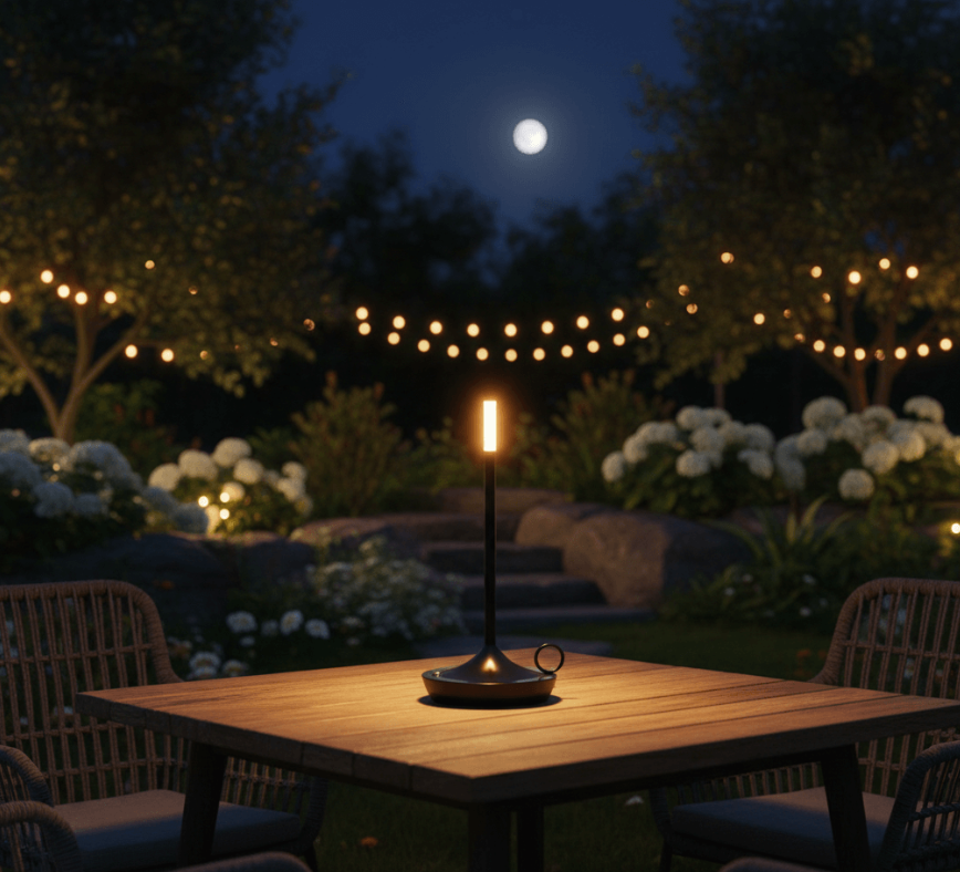 The “Rustic Glow” delivers warmth and calm through its soft lines and matte finish. Compact in size (11×11×28.5 cm), it provides 2W of LED light with 3 adjustable temperatures. Rechargeable and cordless, it’s perfect for cozy cafés, hotel lounges, waiting areas, or romantic restaurant settings, even outdoors under covered terraces.