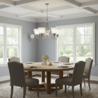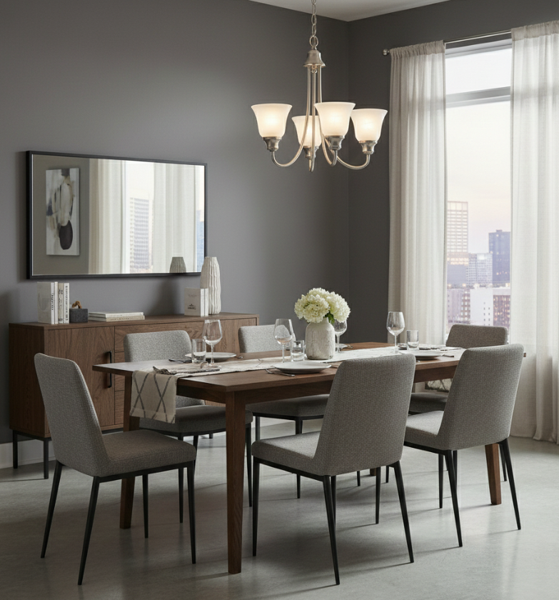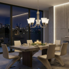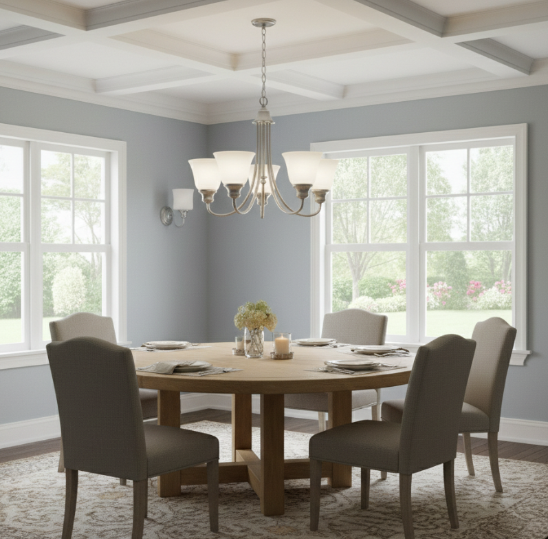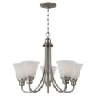 Sarah Series, Ceiling Lighting Pendant x 5 Bulbs. The most imposing model in the Sarah collection, this five-light pendant is perfect for large spaces seeking classic style with a modern twist. With a brushed nickel (BN) structure, five alabaster glass shades, and dimensions of 26″ wide by 16-1/2″ high, it provides generous and well-distributed lighting. Compatible with E26 bulbs of up to 100W (not included), it’s ideal for living rooms, dining areas, or foyers where elegance and functionality go hand in hand.