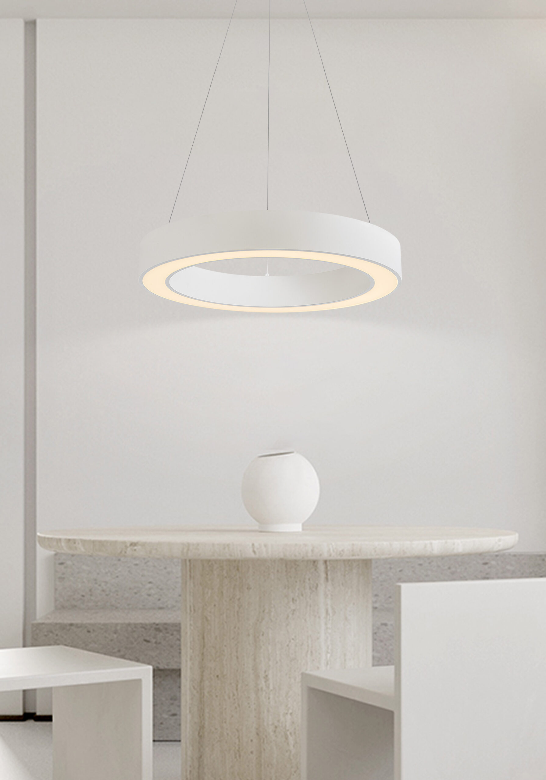 VENUS Series, LED Pendant Lamp – 600×80–1200 mm, 42W. Designed for those who appreciate clean lines and efficiency, the Venus lamp features a slim ring of continuous LED light suspended with grace. Its 42W system offers dimming and 5-step CCT adjustment (2700K–5000K), ensuring personalized illumination. Ideal for modern offices, dining spaces, or rooms where sleek design is key