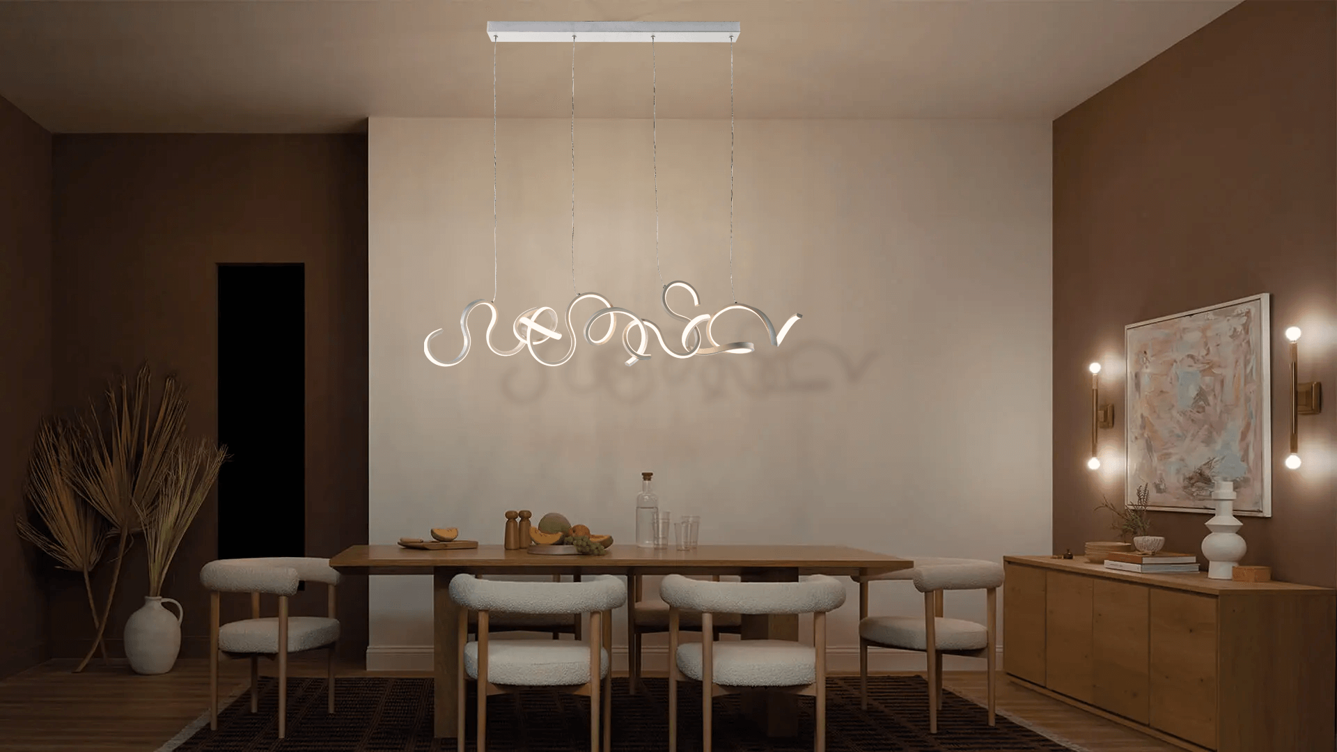 VICTORIA Series, LED Pendant Lamp – 1100×190×1200 mm, 60W.A sculptural pendant that brings fluidity and visual motion with its continuous organic line. With 60W of efficient LED, dimmable and adjustable in color temperature (2700K–5000K, 5 levels), the Victoria lamp suits large living areas, modern dining rooms, or statement entrances.